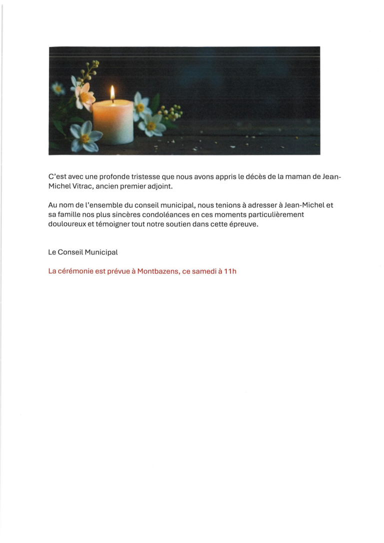 C’est avec une profonde tristesse que nous avons appris le décès de la maman de Jean-Michel Vitrac, premier adjoint de l’ancienne municipalité. Au nom de l’ensemble du conseil municipal, nous tenions à adresser à Jean-Michel et sa famille nos plus sincères condoléances en ces moments particulièrement douloureux et témoigner tout notre soutien dans cette épreuve. […]