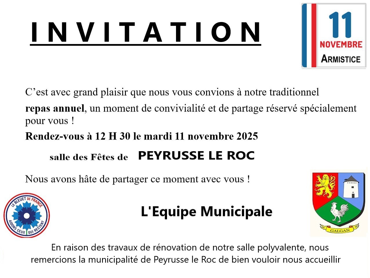 INVITATION POUR TOUS LES HABITANTS DE GALGAN DE PLUS DE 60 ANS AVEC LEUR CONJOINT – Rendez vous le mardi 11 novembre 2025 12 h 30 salle des fêtes de PEYRUSSE LE ROC en raison des travaux de rénovation de notre salle des fêtes